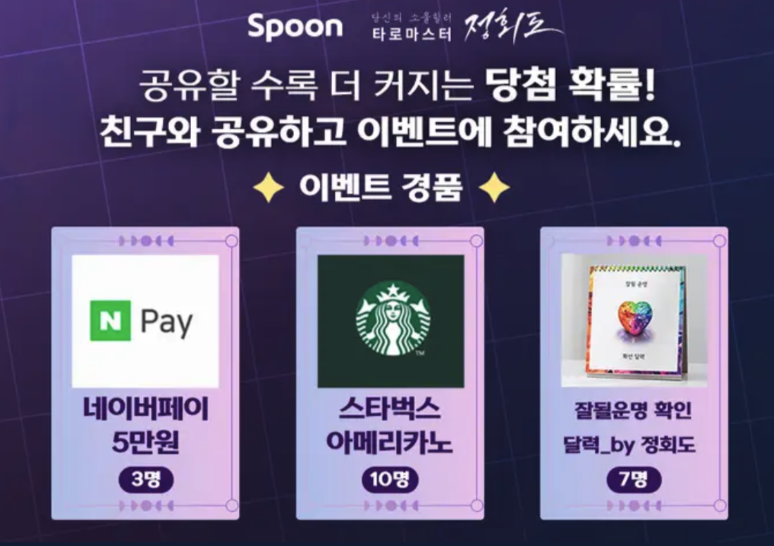 그럼 아래 링크에서 무료로 신년운세도 보시고 경품도 당첨되시기를 바라면서 글을 마칠게요 ! 무료로 2023년 신년운세 서비스를 제공해주신 스푼과 타로마스터 정회도님께 감사드립니다.