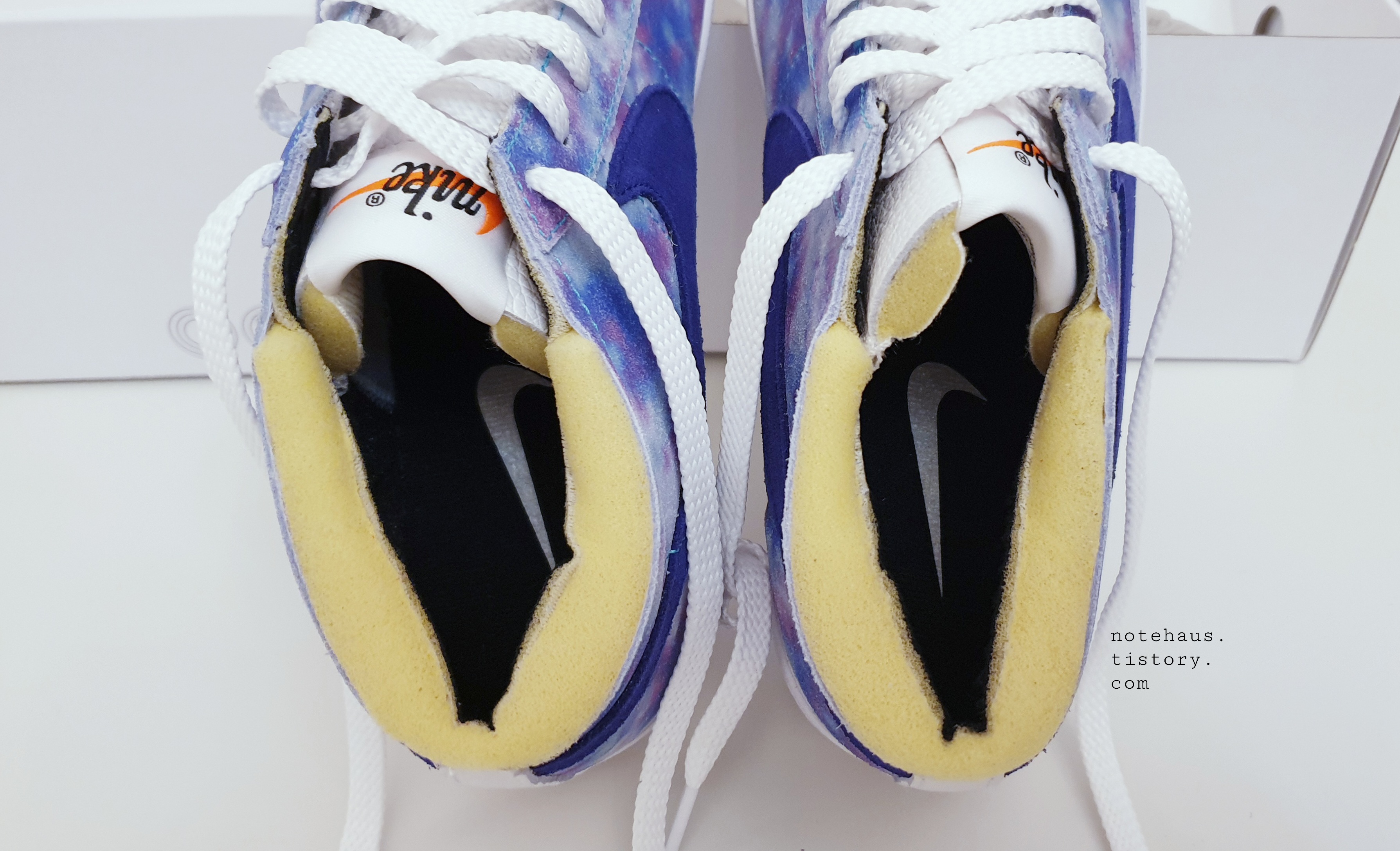 커스터마이징 웹 화면을 통해서 봤을때 난 이 부분이 노란색 천으로 마감이 된 것인줄 알았다. 진실은 곱게 깎인 노란 솜의 단면이었다. 일단 신어보고 다시 후기를 남기겠다. 곱게 깎여서 속살이 아주 시원하게 드러난 이 솜의 기능을 신어보고 남기겠다. 너무 기대되서 찬 물 좀 마셔야겠다.