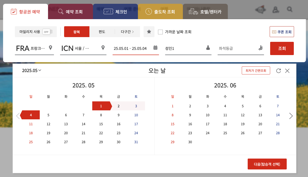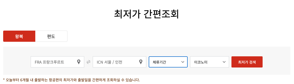 할인 항공권은 특정 출발 기간 내에만 적용됩니다. 여행 계획을 세우기 전에 출발 가능 기간을 먼저 확인하세요.
