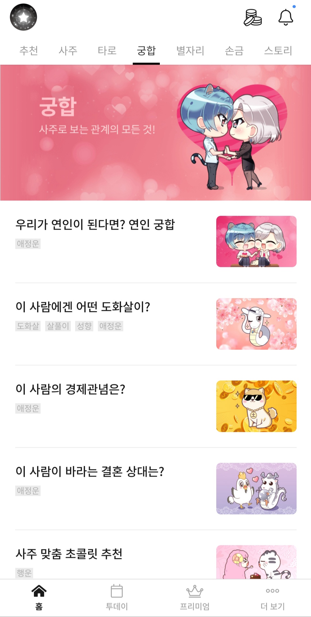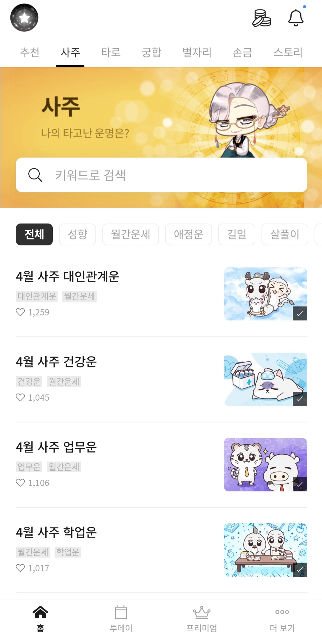 5. 꾸준히 유료로 사용하는 컨텐츠는 궁합말고는 없다. 아주 가끔, 유료 컨텐츠로 제공되는 것 중 가장 저렴한 사주를 보기도 했었는데, 아무래도 "유료"이다 보니 나의 기대감이 너무 컸던 것 같다.